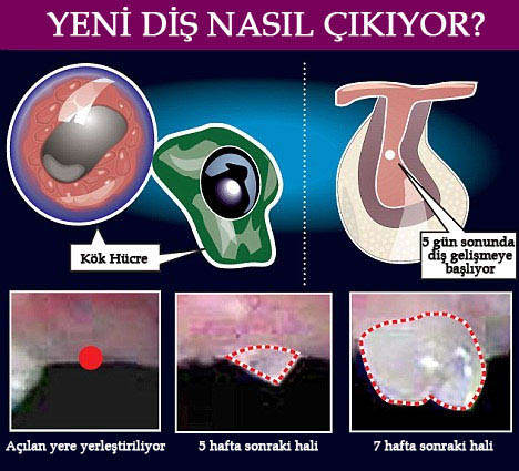 BBC ve Daily Mail'in haberine göre, Tokyo Bilimler Üniversitesi araştırmacıları, kök hücrelerle bir dişin büyümesi için gereken "bilgiyi" içeren dokuyu, farenin çene kemiğine naklettiler.